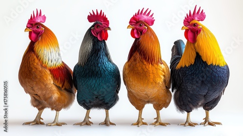 © cpl, Fototapeta premium Four colorful roosters standing in a row against a white background.