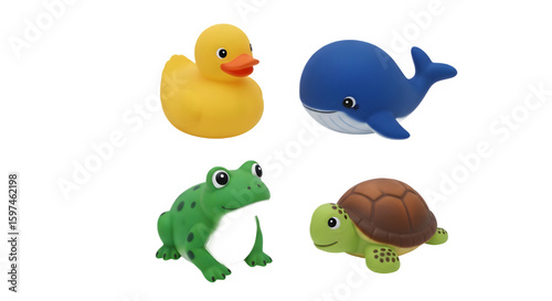 Fototapeta premium Four colorful rubber bath toys isolated on white background, including duck, whale, frog, and turtle