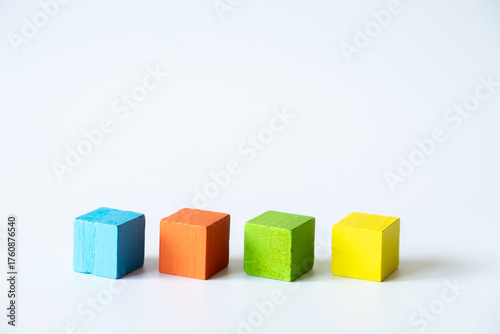 Obraz premium Four Colorful Wooden Cubes Arranged in a Row on White Background