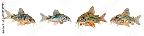 Fototapeta premium Four Corydoras Catfish Showing Diverse Colors and Patterns isolated on transparent background.