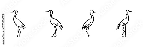 © Toxa2x2, Naklejka premium Four Crane Bird Line Icons In Doodle Style. Elegant Bird Silhouettes, Wildlife And Nature Representation Outline Sketch Collection. Hand Drawn Isolated Vector Illustration