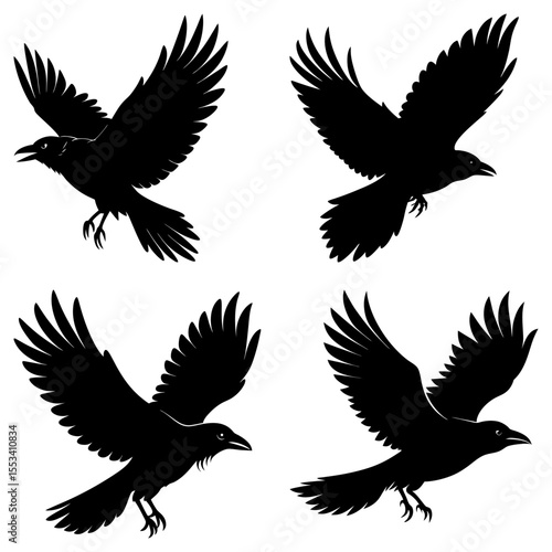© Love, Fototapeta premium Four crows in flight isolated on white background in silhouette