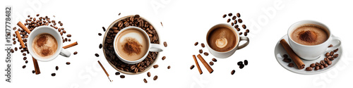 Fototapeta premium Four cups of coffee with cinnamon and roasted coffee beans arranged on a transparent background with one cup featuring a spoon and additional cinnamon sticks