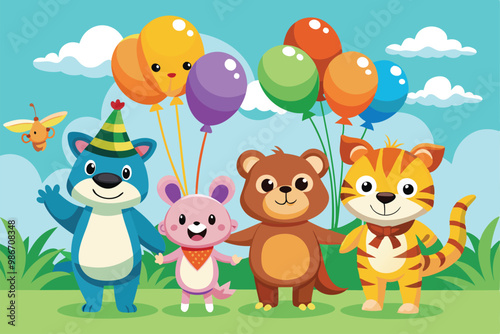 Naklejka premium Four customizable cartoon animals celebrate together holding vibrant balloons...