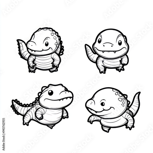 Obraz premium Four cute cartoon dinosaurs in playful poses, designed for children's...