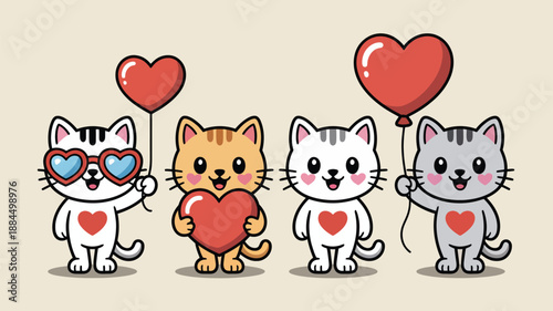 Fototapeta premium Four cute cats with hearts and balloons Vector