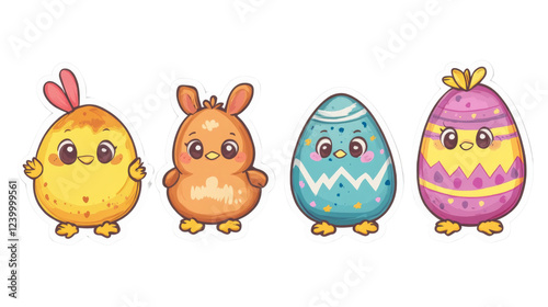 Naklejka premium Four cute kawaii easter stickers with chicks and decorated eggs on...