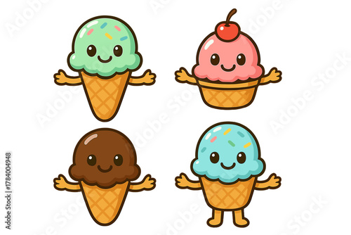 Obraz premium Four cute smiling ice cream characters in cones and cups