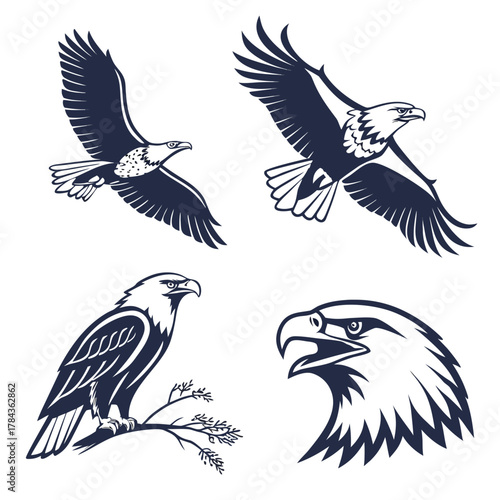 Obraz premium Four dark blue eagle illustrations on white background