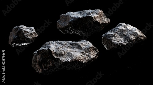 Fototapeta premium Four dark grey rocks isolated on black background. Perfect for game assets, website design, or texture maps. Raw, rugged, and natural.