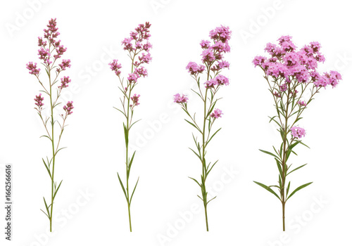 © Muaz, Naklejka premium Four delicate pink wildflowers with stems and leaves, isolated on transparent background