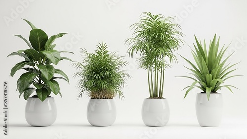 © Arifa, Obraz premium Four different green houseplants in smooth white oval pots arranged in a row on a plain white background