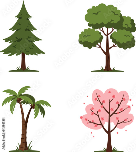 Obraz premium Four different tree types flat design with green and pink foliage minimal style vector illustration