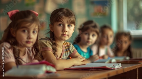 © chutikan, Fototapeta premium Four diligent pupils sitting in row and studying at classroom