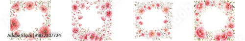 Fototapeta premium Four distinct delicate pink floral frames with green leaves each showcasing unique botanical artistry isolate