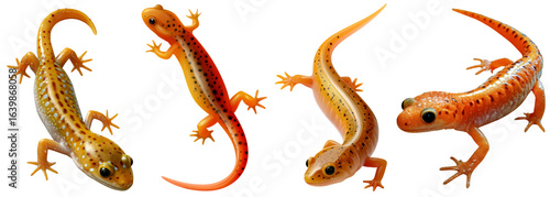 © dee-nesia, Obraz premium Four Eastern Newts in various poses against a white background, showcasing their orange and yellow coloration.