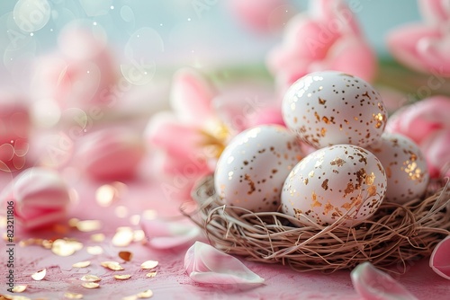 Fototapeta premium Four eggs nest gold flakes pink table