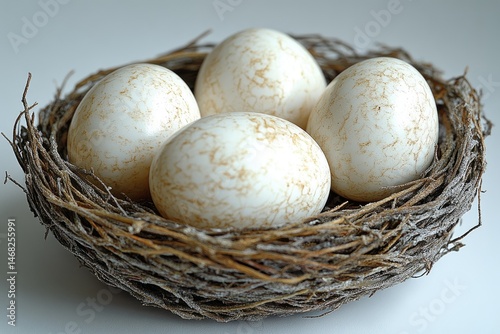 © mahir, Obraz premium Four eggs nestled within a rustic bird's nest.