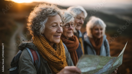 Fototapeta premium Four Elderly Women Hiking Together on a Scenic Trail, Examining a Map with Copy Space, Minimalistic Composition, Warm Sunset Lighting, Outdoor Adventure, Senior Friendship