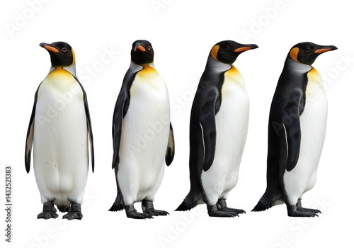 Fototapeta premium Four emperor penguins stand in a row, showcasing their black and white plumage against a white background