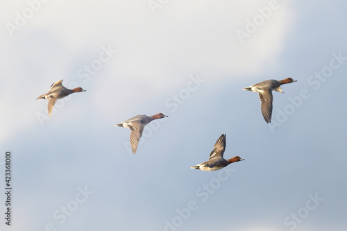 Fototapeta premium Four Eurasian Wigeon duck (Mareca penelope) in flight, Cornwall, UK.