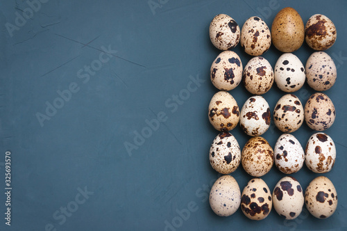 Fototapeta premium Four even rows of small quail Easter eggs on a dark blue grey background with...
