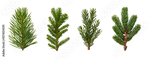 Naklejka premium Four Evergreen Sprigs with Needle-like Leaves Arranged on a White Background...
