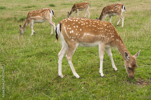 Fototapeta premium Four fallow deer grazing in field
