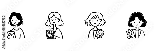 © Toxa2x2, Naklejka premium Four Female Professionals Holding Clipboards Line Icon Set In Doodle Style. Business, Education, And Creative Planning Outline Sketch Collection. Hand Drawn Isolated Vector Illustration