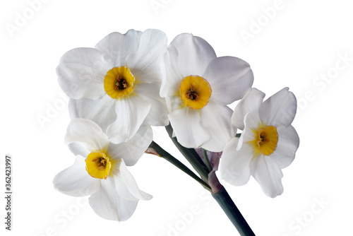 © NATALYA, Obraz premium four flower heads of daffodil on one stalk isolated on white background