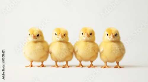 © TAHIYA, Fototapeta premium Four fluffy yellow chicks standing in a row on a white background