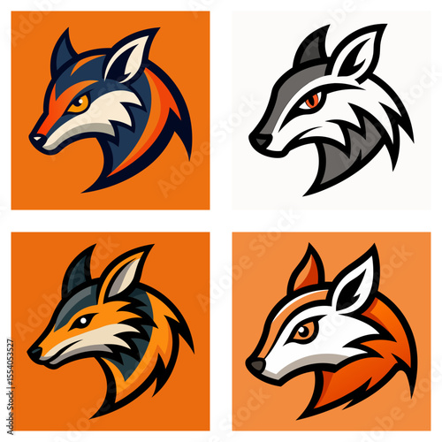 © VectorArt, Fototapeta premium Four fox head logos in different color schemes on orange backgrounds in a square format design