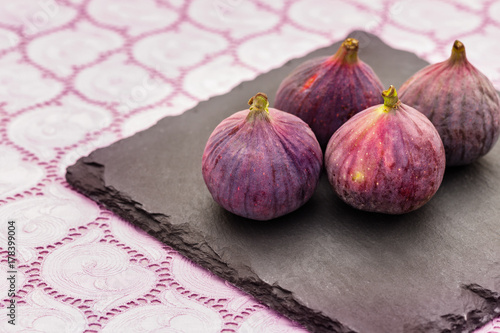 Fototapeta premium Four fresh purple Figы on black slate plate on purple lace tablecloth