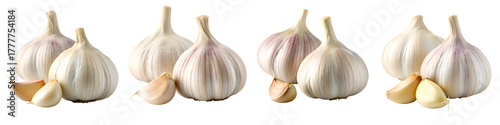 Obraz premium Four garlic bulbs isolated on transparent background, closeup view