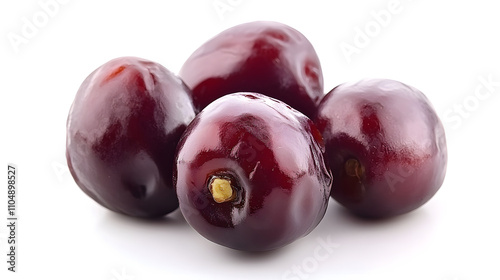 © DeepView, Obraz premium Four glossy, dark red jujube fruits arranged on a white background.