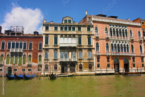 © dbvirago, Naklejka premium Four Gondolas by Buildings in Venice