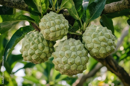 © PICK YOUR POV, Fototapeta premium Four green cherimoyas growing on a tree branch among lush leaves.