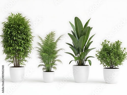 Fototapeta premium Four Green Potted Plants Against White Background green plants white pots indoor plants
