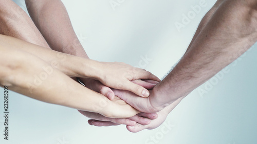 © emaria, Fototapeta premium Four hands getting together on a white background.