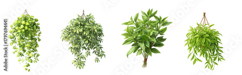 Obraz premium Four hanging plants with green leaves isolated on a black background in a...