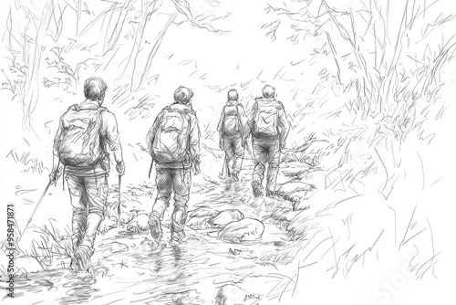 © Kitta Studio, Naklejka premium Four hikers, equipped with backpacks and trekking poles, navigate a winding stream amidst a lush, verdant forest.