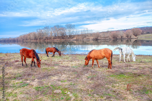 © Leilani, Fototapeta premium four horses grazing on the riverside