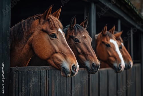 Obraz premium Four horses peering from stalls. A close-up shot of four horses in a stable, looking out from their stalls, perfect for equestrian-related projects or themes of curiosity.