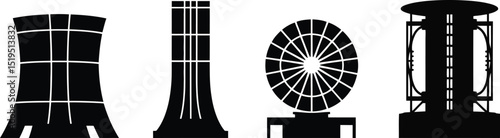 Obraz premium Four industrial structures in black silhouette against a white background in...