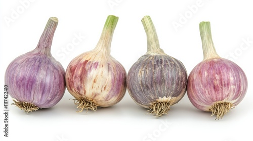 Fototapeta premium Four isolated garlic cloves on a pure white background, natural food photography concept.