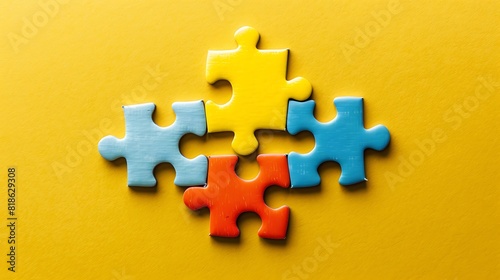 © Emma, Fototapeta premium Four jigsaw pieces on yellow background