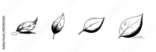 © gentle studio, Naklejka premium Four Leaves Doodle Sketch Set. Nature, Growth, And Botanical Illustration In Hand Drawn Style Collection. Detailed Leaf Designs With Textured Patterns. Isolated Vector Illustration