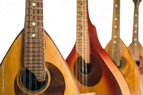 © vladk213, Fototapeta premium Four mandolins close up. Isolated on a white background. Selective focus.