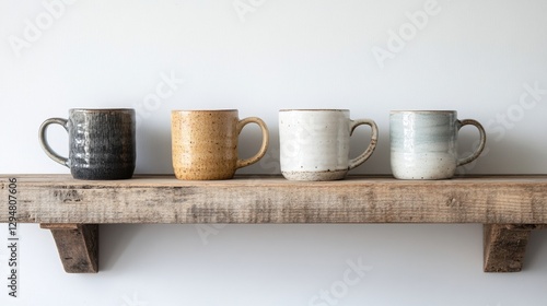 Fototapeta premium Four mugs of different colors and designs sit on a wooden shelf.