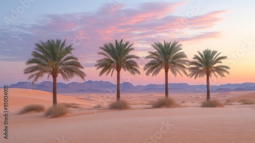© irawan710, Fototapeta premium Four palm trees in desert sunset.